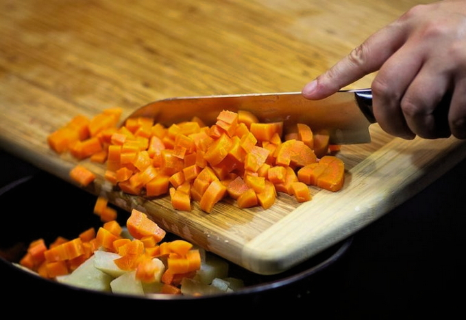 - Snijd de voorbereide groenten met een mes in stukken die niet groter zijn dan een erwt.