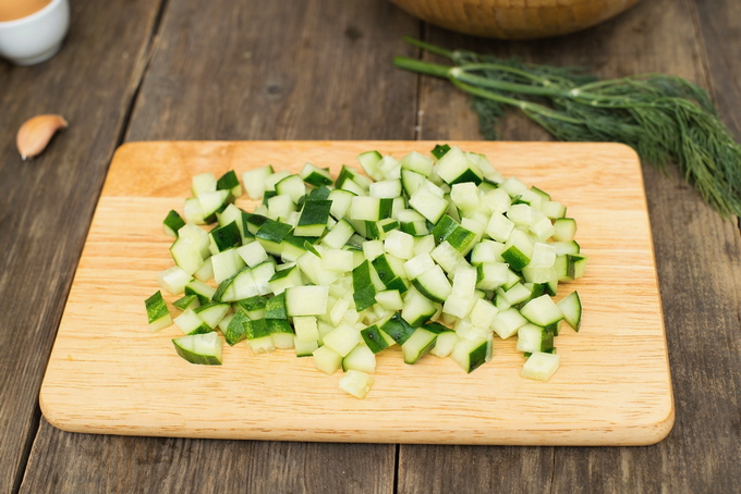 - Was de komkommers, verwijder de uiteinden, droog ze af met een servet, snijd ze in dezelfde blokjes en voeg ze toe aan de rest van de groenten.