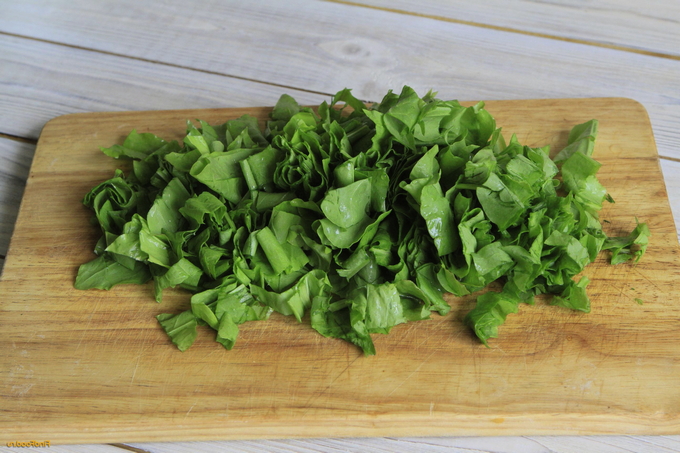 - Spoel de veren van de groene ui en de zuring, droog ze af met een servet, hak ze fijn en voeg ze toe aan de vinaigrette.
