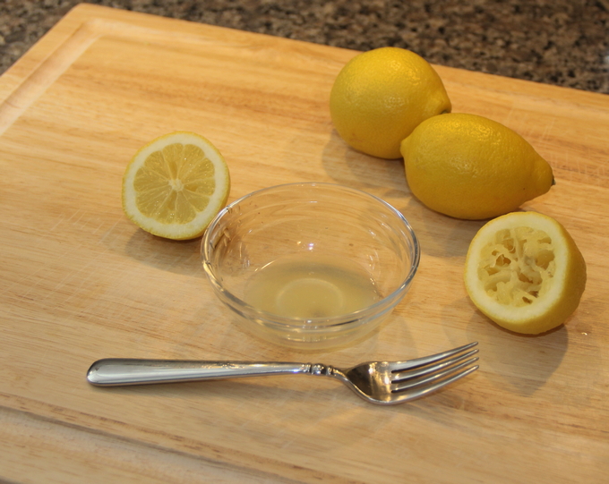 - Knijp het sap van een halve citroen uit in een kom, meng dit met olie, zout en zwarte peper en schenk deze dressing over de vinaigrette.