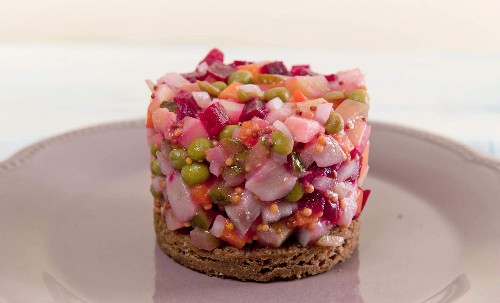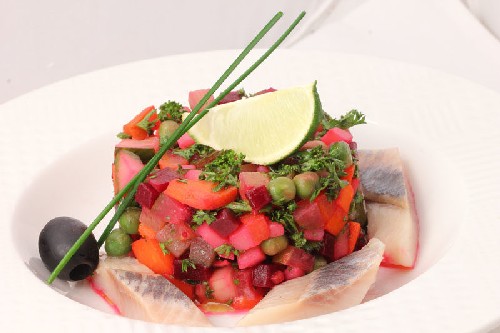 - Zet de gekookte vinaigrette 2 uur in de koelkast en serveer. Bestrooi de vinaigrette met verse kruiden en garneer met stukjes haring.