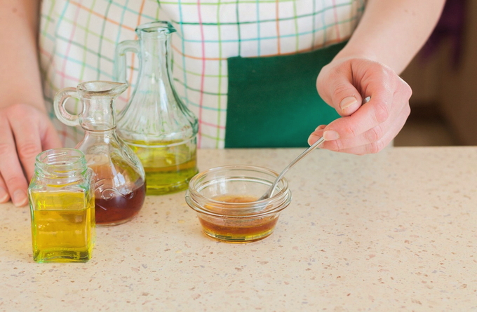 - Maak vervolgens de vinaigrettedressing. Schenk de benodigde hoeveelheid zonnebloemolie en appelciderazijn in een aparte kom.