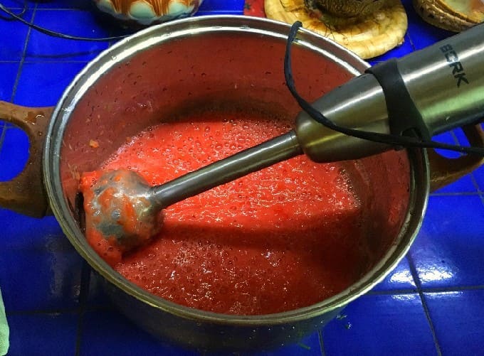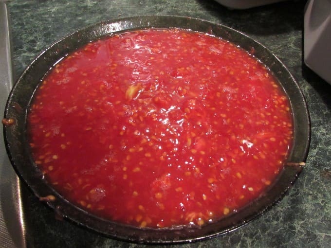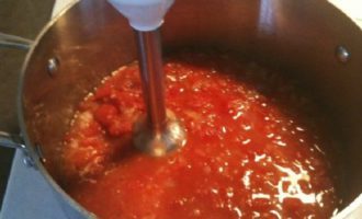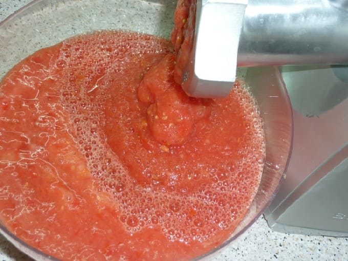 - We wassen de tomaten en schillen ze, hiervoor maken we kruissneden op elke groente, dompelen ze een minuut in kokend water en verwijderen dan de schil. Snijd de tomaten in plakjes en maal ze in een vleesmolen of blender.