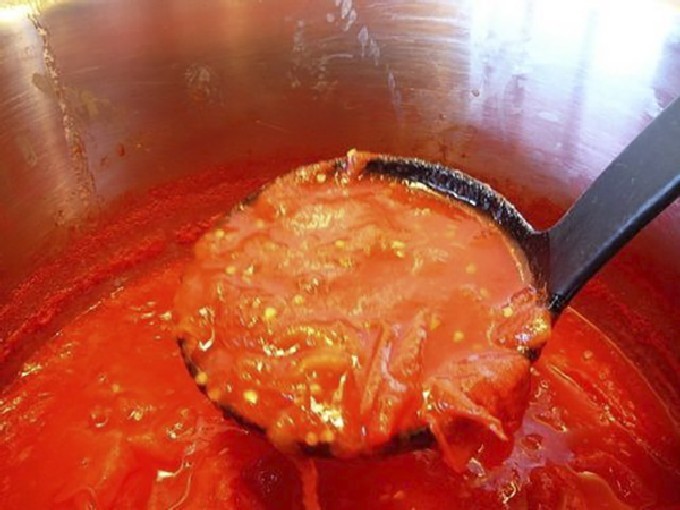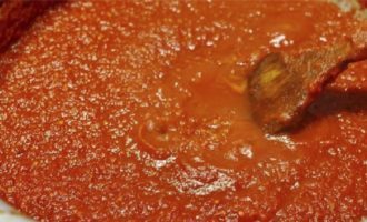 - Giet tomatenpuree in een pan, als het erg dik is, dan kun je de pasta verdunnen met water, in een consistentie van 1 tot 3. Voeg suiker, zonnebloemolie, paprika, zout en azijn toe aan de pasta in de pan, breng de mengsel aan de kook op laag vuur, af en toe roeren en het schuim verwijderen.