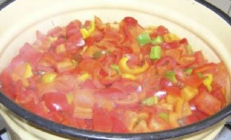 - Doe tomaten, paprika's, uien, kruiden, zout, 50 milliliter water in een diepe geëmailleerde pan, roer en laat op laag vuur 10-15 minuten sudderen na het koken.