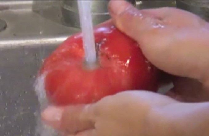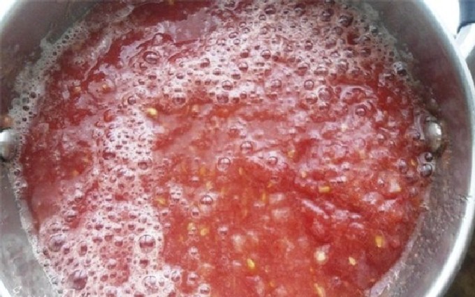 - We wassen de tomaten, drogen ze, leggen ze in kokend water en schillen ze voorzichtig af, snijden ze in verschillende plakjes. Maal tomaten met een blender of in een vleesmolen.