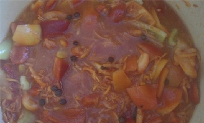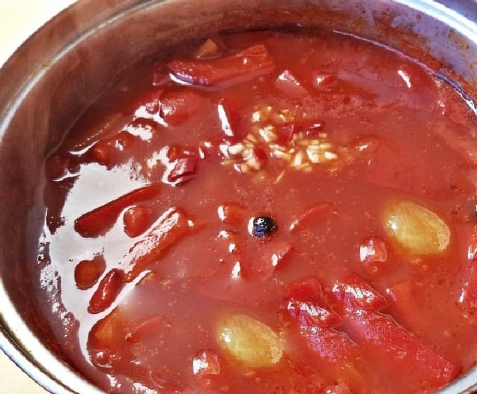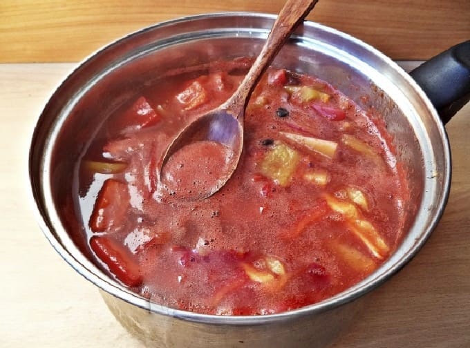 - Doe paprika en ui in kokend tomatensap, laat de inhoud van de pan op middelhoog vuur 15-20 minuten sudderen na het koken.