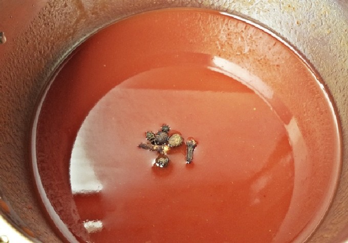 - Snijd de tomaten in kleine stukjes, doe ze in een pan en kook ze 30 minuten. Koel de tomatenpuree af en wrijf deze door een fijne zeef om de resten van de schil te verwijderen. Breng het tomatensap aan de kook en voeg er zout, suiker, kruiden, azijn en plantaardige olie aan toe, meng, breng aan de kook.