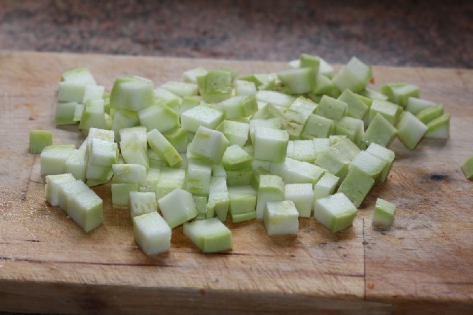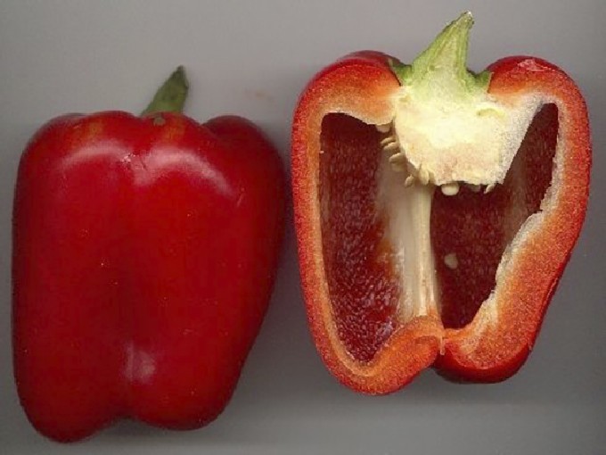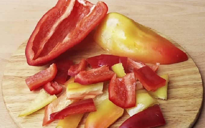- Snijd de paprika in twee helften, verwijder de steeltjes, zaden en tussenschotten, snijd het vruchtvlees in kleine stukjes.