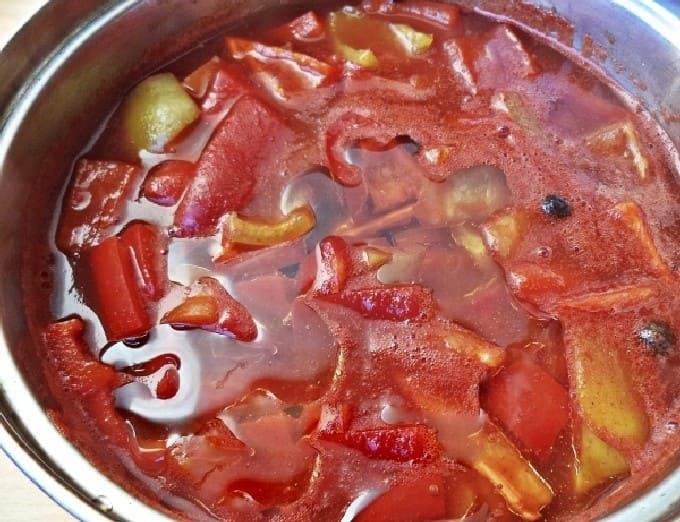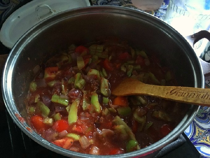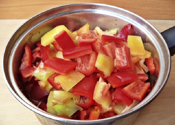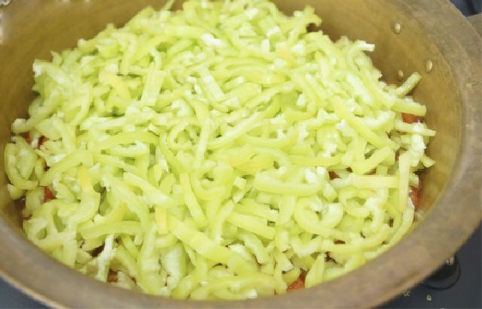 - Doe de paprika bij het tomatenmengsel en kook 15-20 minuten nadat de inhoud van de pan kookt.