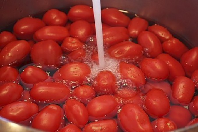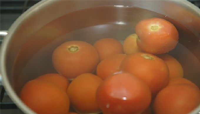 - Was rijpe en vlezige tomaten, maak een inkeping in elke groente kruiselings, dompel 1 minuut in kokend water. Verwijder vervolgens voorzichtig de schil en snijd de tomaten in plakjes.