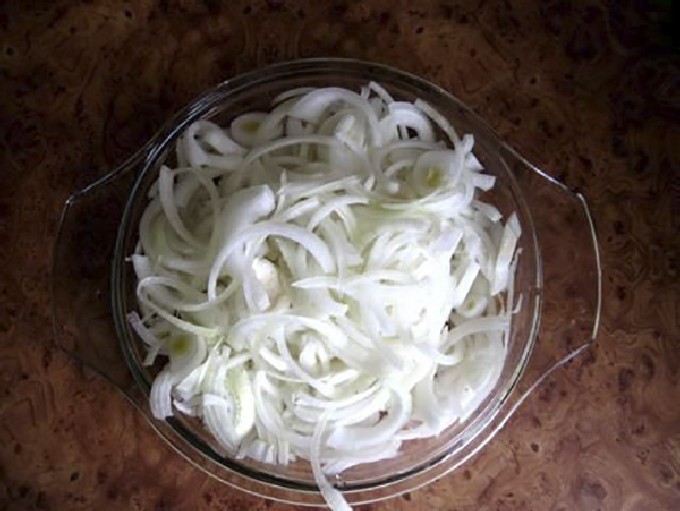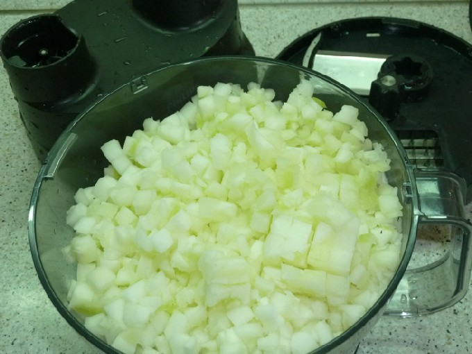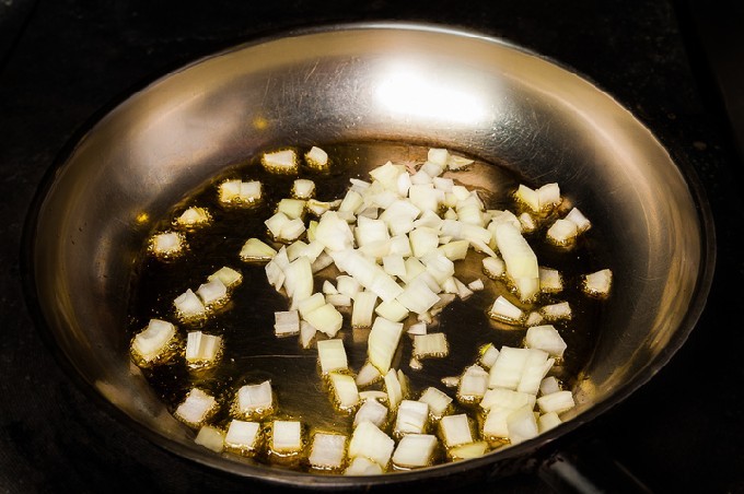 - Schil de uien, snijd ze in blokjes. Fruit de ui in zonnebloemolie tot hij half gaar is.