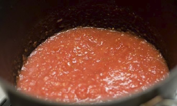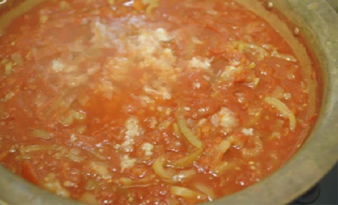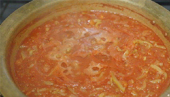 - Doe tomatenpuree, zout, suiker, kruiden met groenten en laat 30 minuten op middelhoog vuur sudderen.