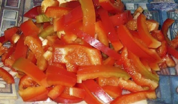 - We wassen de paprika's, verwijderen de stengels, zaden en partities, snijden ze in kleine reepjes.