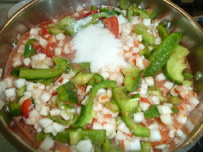 Voeg aan de reeds lichtgekookte tomaten gehakte pepers, kruiden toe en kook nog 20 minuten vanaf het moment van koken.