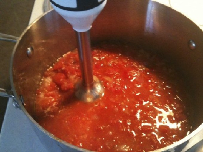 - We wassen de tomaten, snijden de stengel eruit en snijden in verschillende grote stukken. Maal plakjes tomaat tot puree met een blender of in een vleesmolen.