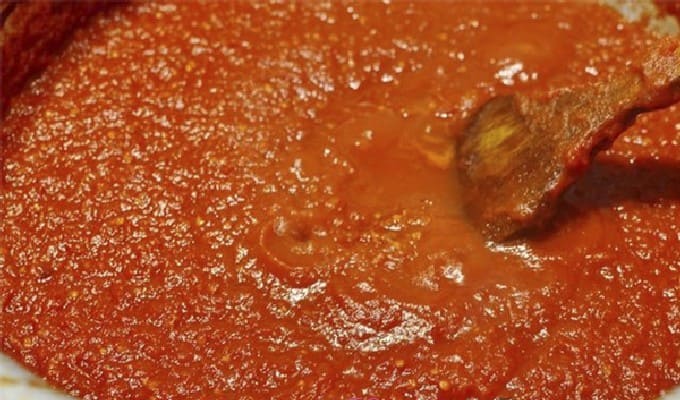 - Voor de bereiding van lecho is het beter om tomatenpuree te kiezen, die alleen tomaten, zout en suiker bevat. Te dikke tomatenpuree kan worden verdund met water.