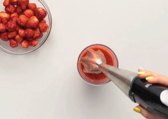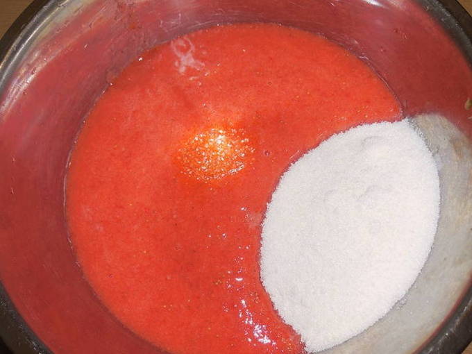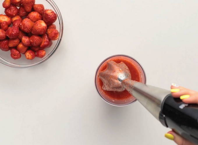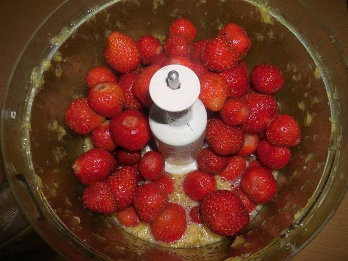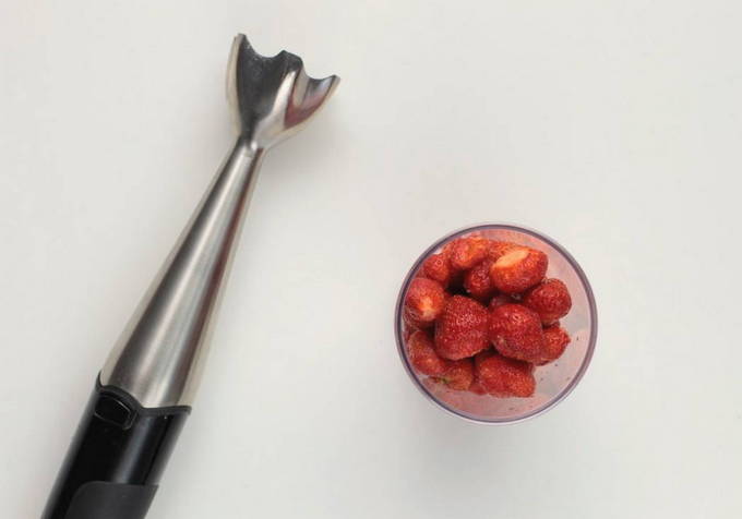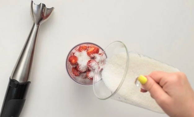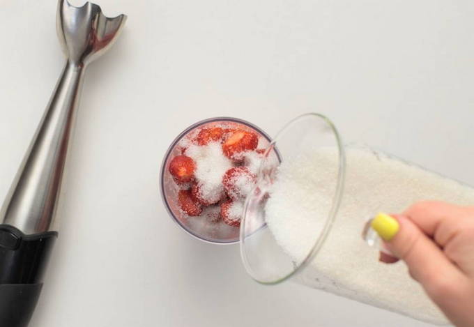 - Daarna verplaatsen we de aardbeien in een bak, bestrooien met suiker en kloppen tot een gladde massa met een staafmixer. In plaats van een blender kun je een keukenmachine, vleesmolen of een andere haktechniek gebruiken die je in je keuken hebt staan.