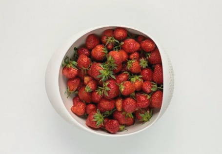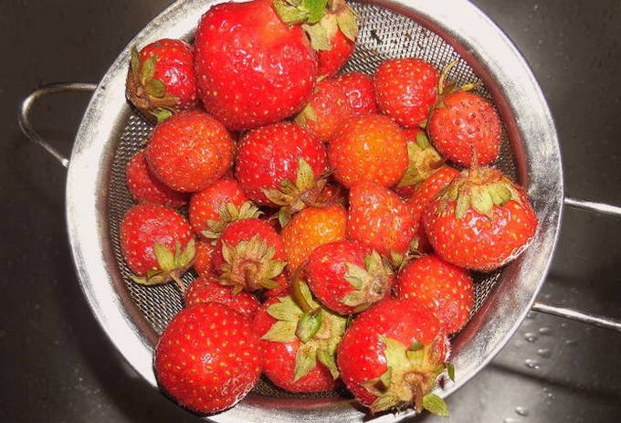 - Spoel de aardbeien grondig af.Dit gaat het gemakkelijkst door een kleine hoeveelheid bessen in een vergiet te doen. Verwijder vervolgens voorzichtig alle stelen.
