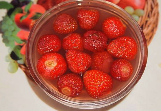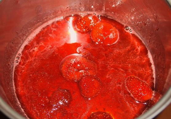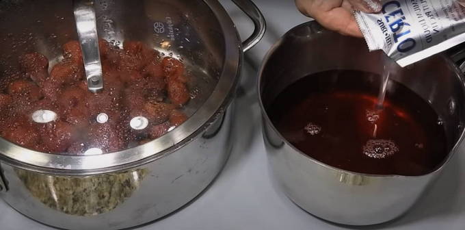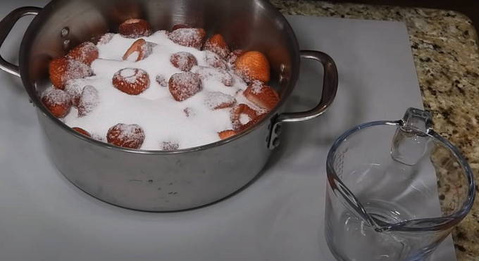 - We wassen de aardbeien en sturen ze naar de pan. We vullen de bes met suiker en laten deze 1-2 uur staan, zodat het sap begint op te vallen. Giet na de aangegeven tijd water in een pan en zet 5 minuten op middelhoog vuur. Breng het mengsel aan de kook. Vervolgens halen we de pan van het fornuis en bedekken deze met een deksel en laten hem afkoelen. Giet het sap in een aparte container en laat de bessen om de gelei te versieren.