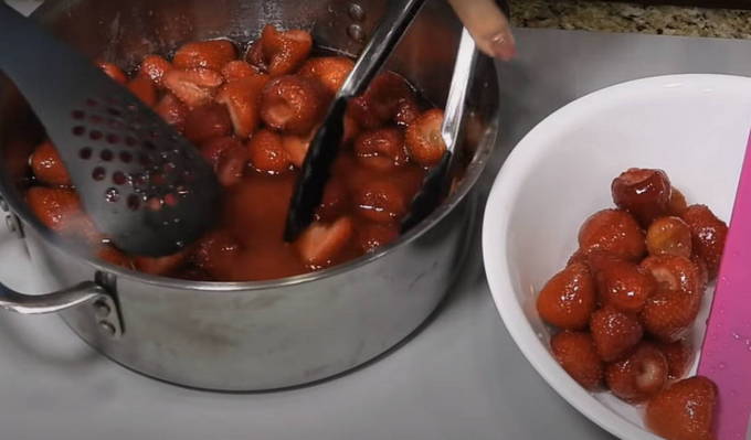 - Met behulp van een tang of een ander apparaat halen we de hele aardbeien in een aparte container om de suiker die eronder is gezakt niet op te scheppen.