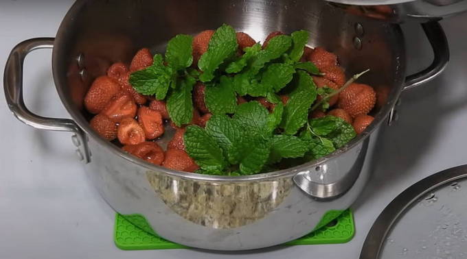 - Doe de aardbeien in de nog hete siroop en doe er 2 takjes munt op.