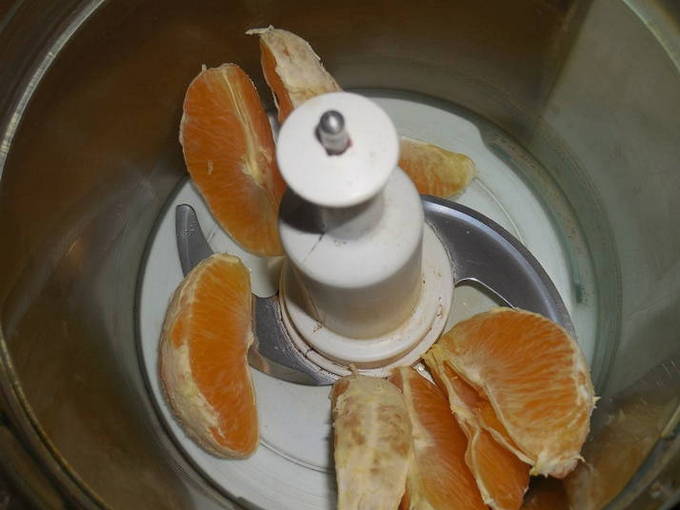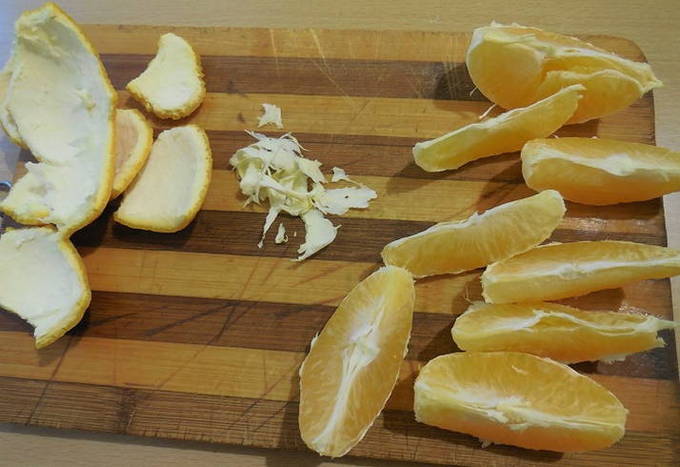 - Schil de oranje en witte strepen, verdeel het fruit in plakjes.