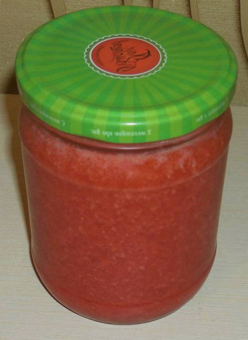 - Giet de aardbeienpuree in potten, sluit de deksels goed en zet in de koelkast. De bewaartemperatuur van dergelijke jam mag niet hoger zijn dan 2 graden. Blanks voor de winter zijn klaar!