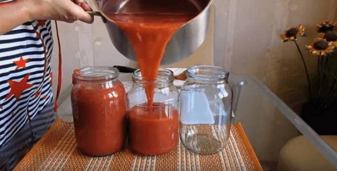 - Giet aardbeienpuree na het mengen in gesteriliseerde potten.