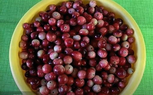- Verse veenbessen sorteren we zorgvuldig en verwijderen klein puin en beschadigde bessen. Daarna spoelen we het goed af met koud water en drogen het af met een theedoek, wat een belangrijk punt is voor rauwe jam.