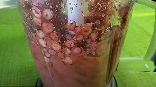 - Maal de veenbessen en de suiker met een blender of keukenmachine tot een gladde massa en de suiker is volledig opgelost.