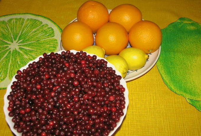 - De eerste stap is het bereiden van de veenbessen en citrusvruchten voor deze bereiding. Sorteer de bessen en verwijder klein vuil, droge twijgen en bedorven fruit. Spoel de veenbessen vervolgens af en dep ze droog op een keukenhanddoek. Spoel sinaasappels en citroenen grondig af met een borstel en verbrand ze met kokend water.