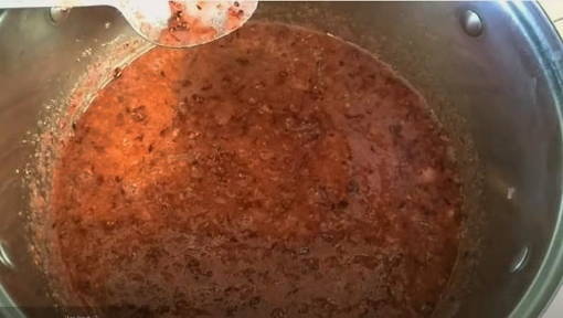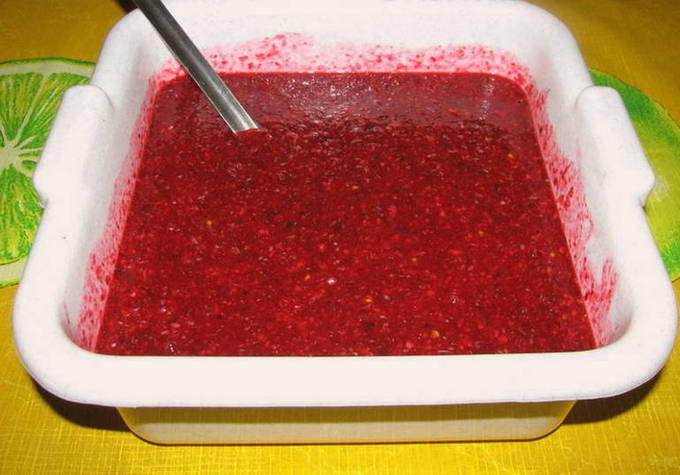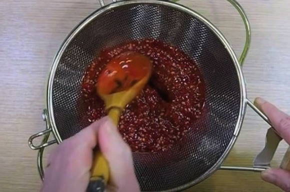 - Wrijf vervolgens de bessenmassa voorzichtig door een dikke zeef om de cake te scheiden.