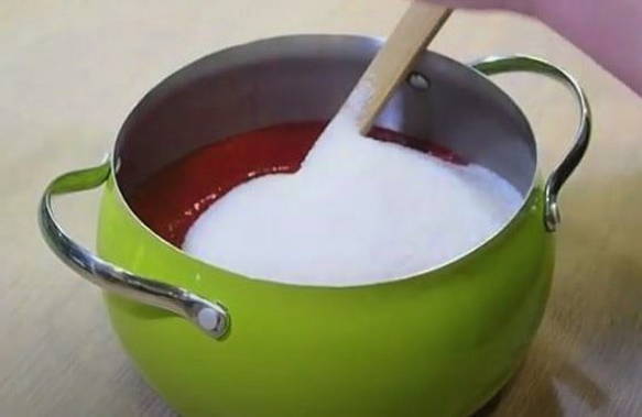 - Giet het in een aparte kom en voeg de berekende hoeveelheid suiker toe. Vervang je suiker door poeder, dan lost het sneller op in de bessenmassa. Meng alles met een lepel en laat 1 uur staan om de suiker volledig op te lossen.
