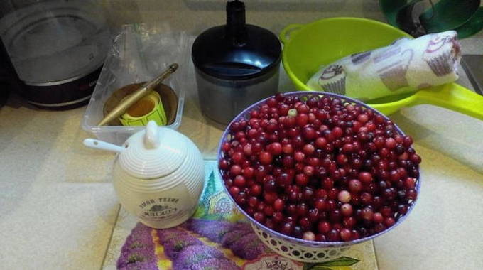 - Sorteer de veenbessen grondig voor het oogsten, spoel ze af en droog ze af met een theedoek. Meet de hoeveelheid suiker en veenbessen af die in het recept wordt aangegeven.