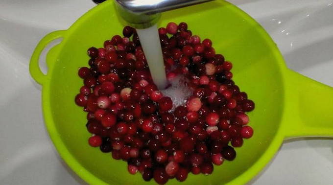 - Sorteer de veenbessen zorgvuldig en verwijder vuil en beschadigde bessen, anders bederven ze de smaak van het werkstuk. Spoel de veenbessen in een vergiet goed af onder stromend water.