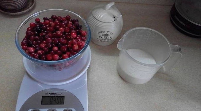 - Vervolgens moeten de veenbessen en de suiker volgens het recept worden afgewogen.