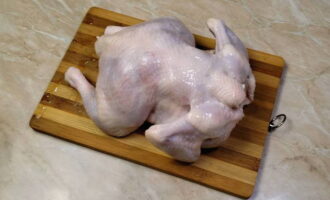 We wassen de kip goed, snijden hem in afzonderlijke delen.