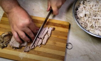 Daarna brengen we al het vlees over in een aparte container en laten we het afkoelen. Zodra het vlees is afgekoeld, moet het worden versneden, waarbij alle onnodige botten worden verwijderd.