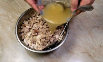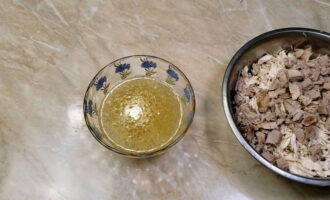Giet de gezwollen gelatine bij de geplette stukken vlees en meng goed.