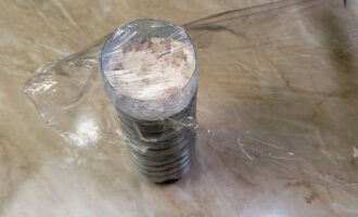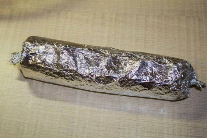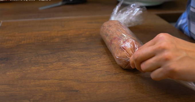 - We wikkelen de gevormde worst in huishoudfolie voor betrouwbaarheid in plastic zakken. Hetzelfde doen we met het tweede deel van het gehakt.