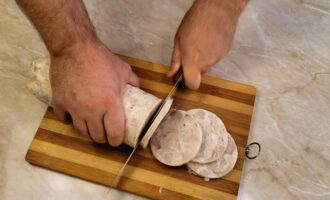 - We halen de gebakken worstjes eruit en laten ze afkoelen op kamertemperatuur. Daarna halen we het uit de hoes en snijden het voorzichtig op de gewenste dikte.