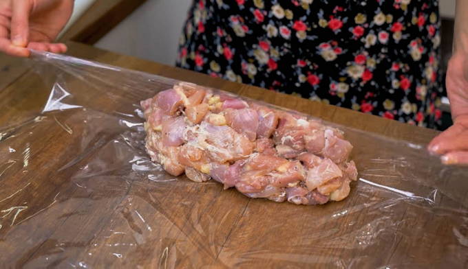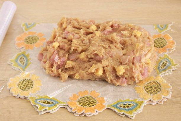 - De voorbereidende fase is afgerond, binnenkort heb je een afgewerkt product op tafel. Leg intussen wat van het gehakt op een stuk huishoudfolie en wikkel het als een snoepje.