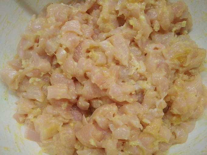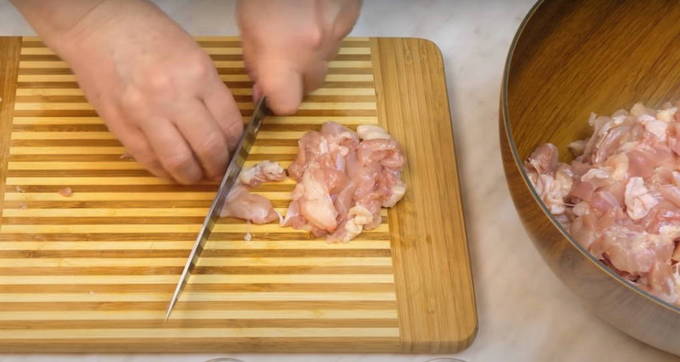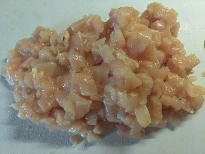 - Laten we, voordat we met het hoofdkookproces beginnen, de kippendijen voorbereiden. Verwijder de schil, spoel grondig en snijd de dijen in zo klein mogelijke blokjes zodat je geen vleesmolen gebruikt. Voeg naar smaak peper en zout toe.