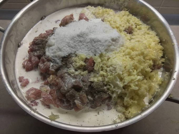 - Pers de knoflook door de knoflook en voeg deze toe aan een gewone kom met vlees en reuzel, breng op smaak met kruiden en giet room. We mixen alles goed met elkaar. We laten het afgewerkte gehakt twee dagen brouwen, genieten van de aroma's van kruiden.