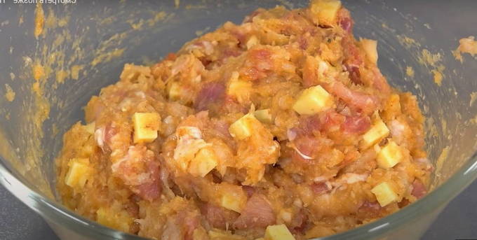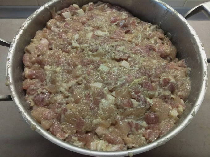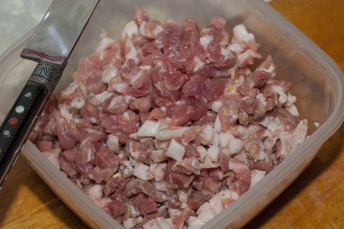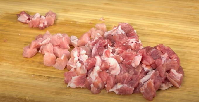- Snijd het varkensvlees in kleine blokjes en combineer met een pasteuze massa.