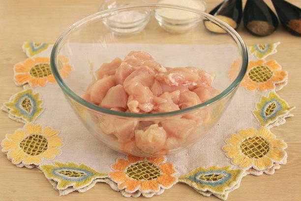 - We wassen het kippenvlees, verwijderen alle botten en snijden in vrij grote stukken zodat de textuur in de afgewerkte vorm te zien is.