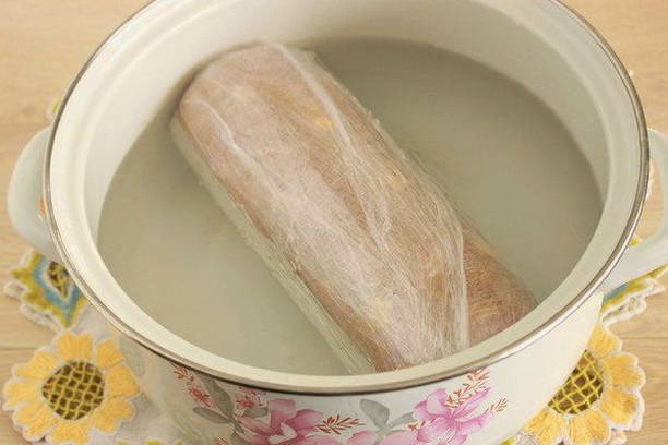 - We sturen de gevormde worst in gekookt water en koken een uur onder een gesloten deksel.