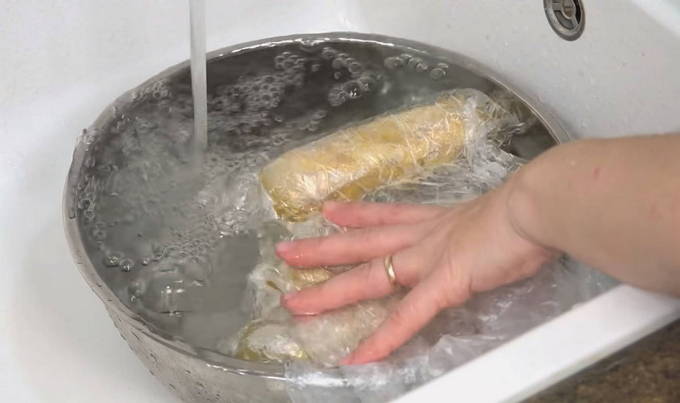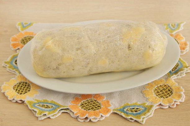 - Deze tijd zou voldoende moeten zijn om alle componenten te lassen en één geheel te worden. Het blijft om de worst iets af te koelen om de hete huishoudfolie te verwijderen en ongeveer 1 uur in de koelkast te laten staan.