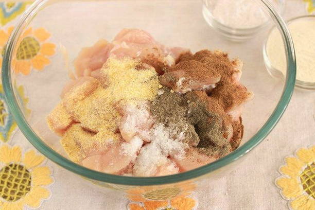 - Voeg zout, gemalen knoflook en nootmuskaat toe aan de gesneden kipfilet. Verwaarloos verschillende kruiden niet, want dankzij hen krijgt het product zijn eigen smaak en aroma.